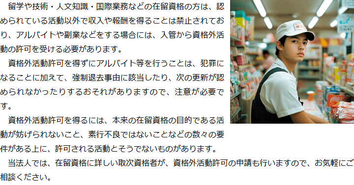 トップビザの種類別サービス内容資格外活動許可 階層構造▼ ビザの種類別サービス内容(目次) 資格外活動許可 ビザの種類別サービス内容(目次)ビザの種類別サービス内容トップ特定技能(就労ビザ)技術・人文知識・国際業務(就労ビザ)就労ビザ(その他)経営管理ビザ国際結婚・配偶者ビザ永住権定住者ビザ家族滞在ビザ短期滞在ビザ帰化申請留学ビザ資格外活動許可インターンシップビザ企業内転勤ビザ高度専門職在留特別許可 受付時間 平日 9時~21時、土日祝 9時~18時 夜間・土日祝の相談も対応します (要予約) 所在地 〒273-0005 千葉県船橋市本町6-1-7KENEDIX船橋3F(旧表記:エスペランサK3F) 0120-41-2403 お問合せ・アクセス・地図